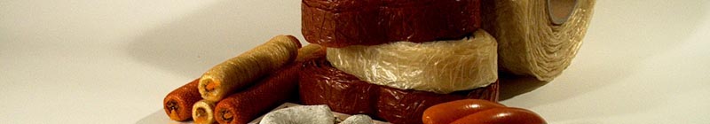 SIE WERDEN in verschiedenen Typen (herkömmliche, leicht schälbare Kollagendärme, essbare, kranzförmige, für Rohwürste) in Kalibern von 32 bis 120 mm hergestellt. In unserem Angebot sind auch Kollagendärme für Schinken in Form von Blättern [Breite 400 und 480 mm ] oder als Folienschlauch [Kaliber 85, 115, 126, 136, 156 mm].